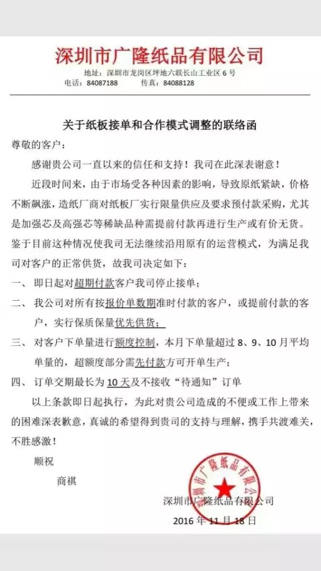 11月19号我不知道别的地方,我知道深圳的原材料紙張漲瘋瞭,一時間所有的包裝行業印刷行業朋友圈都在轉發,我開始憤怒瞭這是要逼著印刷廠都關門嗎?對你們有好處嗎原材料的廠商,你們不想讓我們接單瞭想讓我們斷糧食瞭,沒有紙的日子特别難熬,漫天飛的漲價聯絡單與限産單通知,沒有紙的日子特别難熬,爲什麽說紙價瘋漲也沒人管?並不是要故意制造恐慌 ,也不是要哄擡紙價。就幾天時間公司接到好幾張漲價的通知單,我說如果你告訴客戶他們肯定不願加他的價,這樣的話我們印刷廠就不好接單不好操作,你不可能一一的爲你的客戶去解釋吧,就算他們願意聽我們也沒那麽多時間,換個角度如果印刷廠集體罷工的話,那你們紙廠還有什麽資格是合夥漲價,本身今年明年印刷行業都是很困難的,這個雪上加霜的時候還漲價都不知道報的什麽心态。反正我是有圖有真相的等會有同行的可以看看,大家互相轉發抵制他們原材料漲價。深圳市博霖印刷感謝一路支持的客戶和供應商們特殊時候換位思考謝謝。