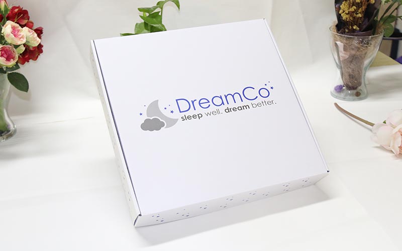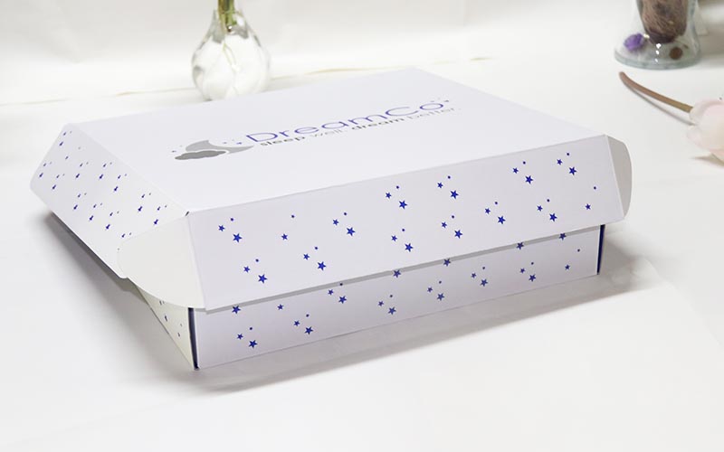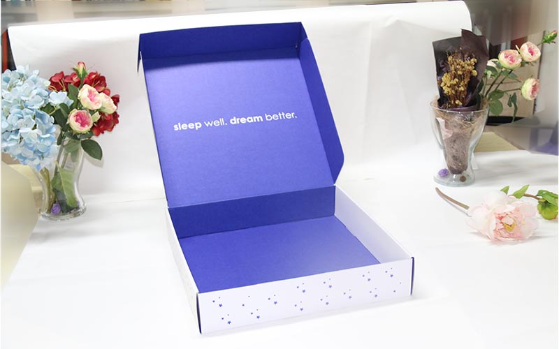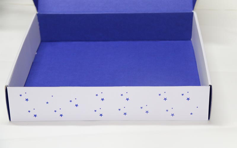 1.材質:盒子有兩個面 ,正面白色的坑紙直接印刷,盒子打開裏面專藍色印刷,坑紙爲WF細坑加強芯,盒型爲飛機盒,最适合服裝的盒子。