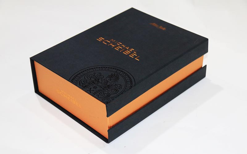 1.材質 :高檔禮品盒定制面紙180G黑色紋路特種紙,不用印刷,盒面皮殼文字燙黃色金擊凸,LOGO圖片絲印局部UV,裱1800G滑面雙灰闆,内盒面紙用180G米黃色萊利紋特種紙,裱1800G滑面雙灰闆。盒型爲翻蓋盒整款盒子都是手工制作