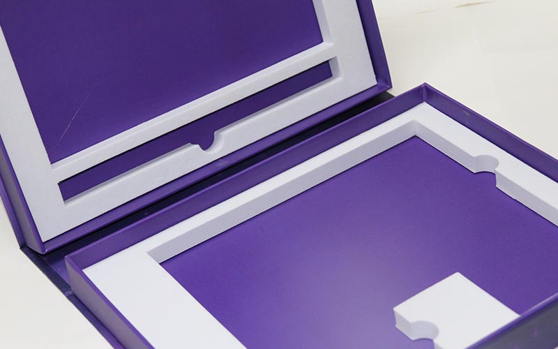 1.材質:盒子面紙採用157G銅版紙,表面彩色印刷,線條UV光油,LOGO文字燙金。裱1500G雙灰闆,盒子爲藍,紫兩個顔色,内托爲白色内盒裏面全部貼滿彩紙,盒型爲上下翻蓋盒磁鐵要有吸度。