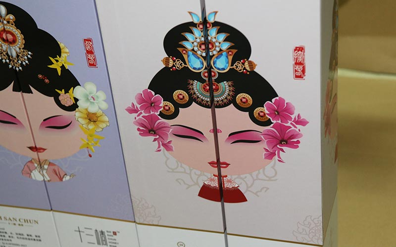 1.材質 :盒子有兩個款式,兩款的材質也一樣,盒子面紙用157G銅版紙單面彩色印刷,盒子中間的人物局部UV光油,文字logo燙黃金和黑金 紅金三種色。盒子的上蓋結構最複雜,整款盒子都是純手工制作。