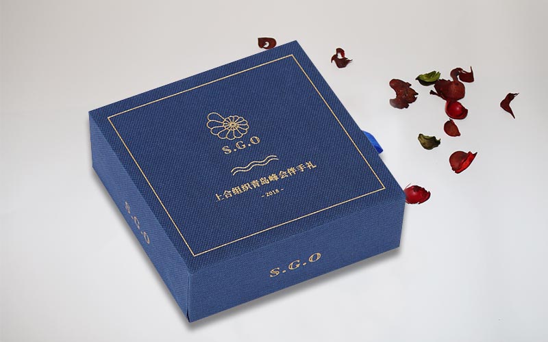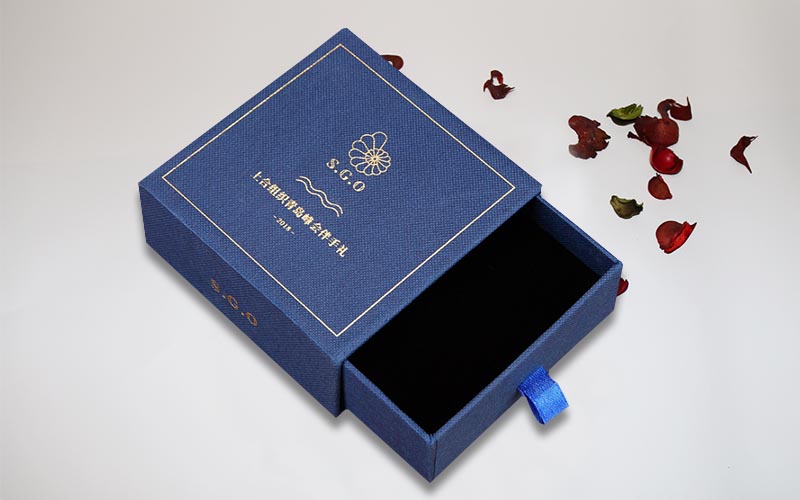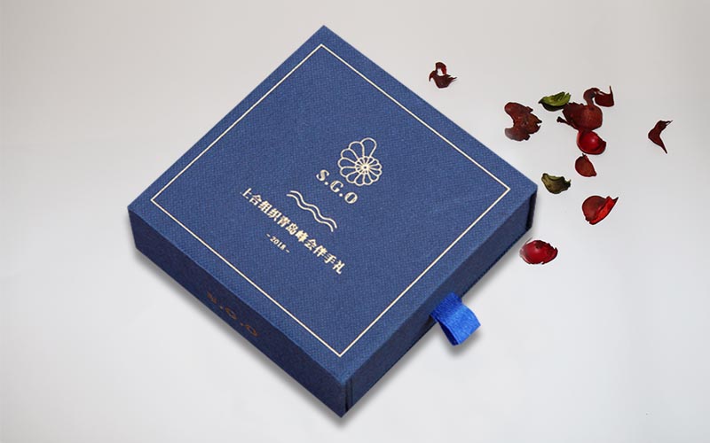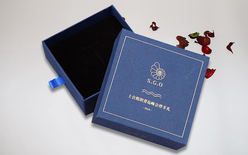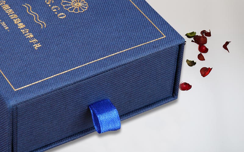 1.材質:盒子面紙採用小石頭紋的藍色特種紙,盒子表面文字LOGO燙金色,裱1200G單白闆,整體盒子爲抽屜盒性,抽拉的地方裝藍色的絲帶。整款盒子手工制作 。