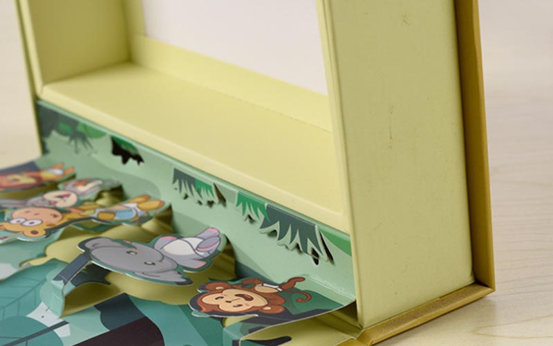 1.材質:盒子材質用157G銅版紙單面彩色印刷,單面覆亞膜 ,裱1500G雙灰闆,内托用350G單粉卡紙印刷裱350G單粉卡紙,裱内襯在襯紙上貼一張啤好模型立體的動物卡片,手工粘好定位,整款盒子手工制作成品。
