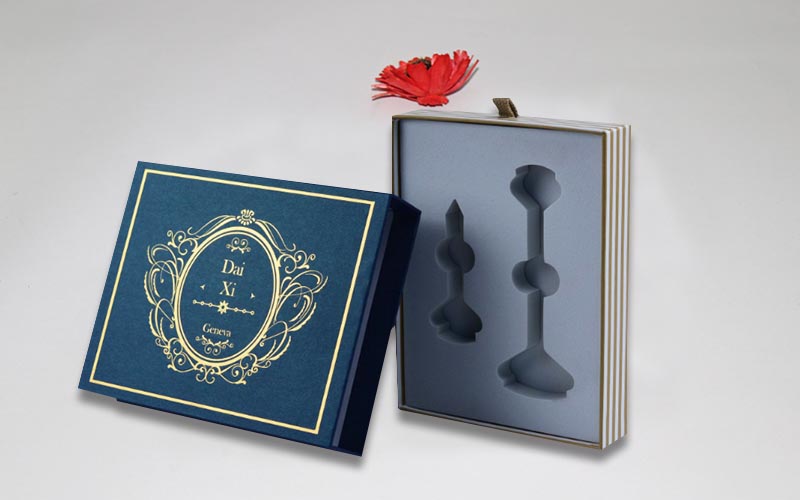1.材質:外盒子用藍色珠光紋路的特種紙,盒子面紙文案燙黃金,裱1200G雙灰闆 ,抽盒157G銅版紙彩色印刷啞膜,裱1200G雙灰闆,内托用白色EVA開V槽固定産品。整款盒子機械化制作。