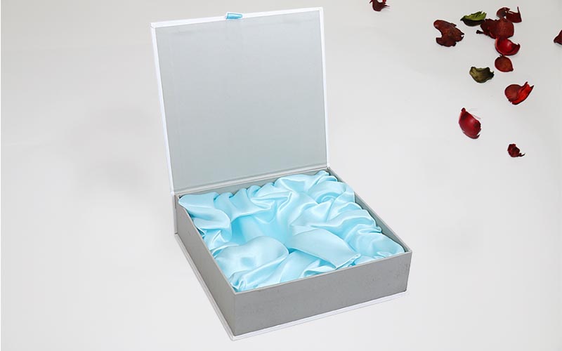 1.材質:盒子的面紙白色特種紙,單色印刷盒子表面的紋理壓紋LOGO擊凸,裱1500G雙灰闆盒子内托用珍珠棉裱淺藍色綢布,盒型爲書本盒整款盒子都是機器制作,品質和外觀還是很很精緻漂亮。