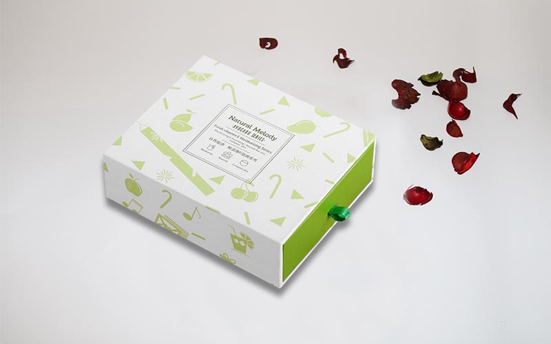1.材質:盒子採用157G銅版紙彩色印刷單面啞膜,小圖片UV光油,裱1200G單白闆,盒子整體爲淺綠色,抽屜盒型粘綠色絲帶盒子,裏面内托爲白色A級材質無味道。