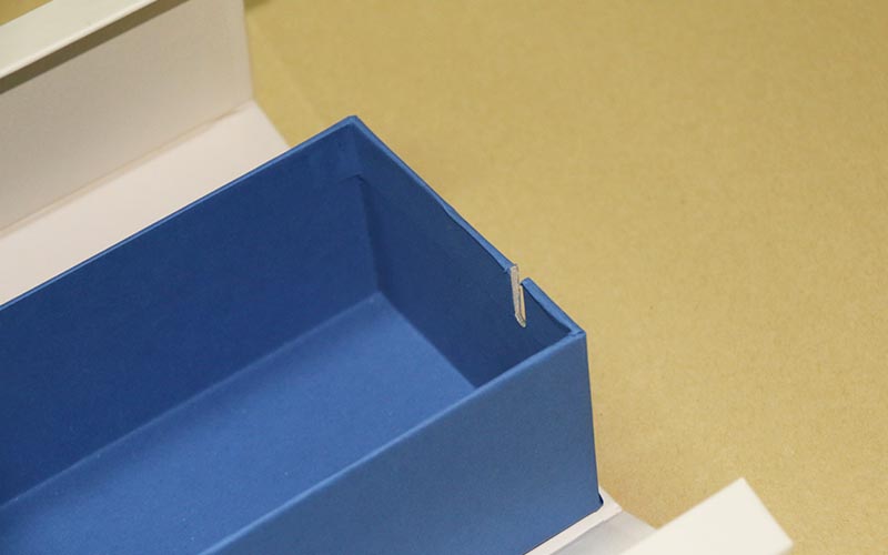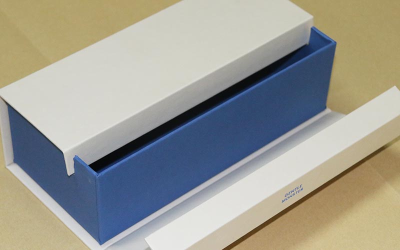 1.材質 :外皮殼用米白色觸感特種紙,(特别有手感的一款紙)燙藍金LOGO,裱1500G立格灰闆,内盒同樣用藍色特種紙裱1500G雙灰闆,内盒左右兩邊開兩個槽位,盒子翻開的地方更好的卡進去,不留縫隙,手工制作。